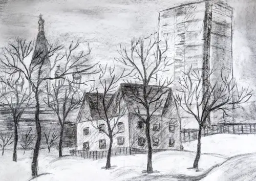 На картине изображён уютный домик среди деревьев. Вокруг — высокие сосны и лиственные деревья, а на переднем плане — сад и дорожка. Настроение спокойное и тихое, как будто в уютном уголке природы. Картина выполнена в чёрно-белых оттенках, создавая ощущение мягкости и ностальгии, подчёркивая тени и свет, что придаёт изображению глубину и спокойствие.