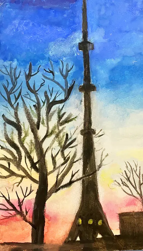 На картине изображена высокая Останкинская башня, которая стоит посреди деревьев. На фоне – красивый закат с яркими цветами: розовым, оранжевым, жёлтым и голубым. В небе есть немного голубого и розового, а деревья вокруг – без листьев, с ветками. Настроение спокойное и тёплое, как вечер перед сном. Цвета яркие и мягкие, чтобы было красиво и уютно.
