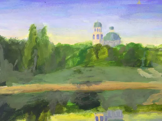 Прекрасный вечерний пейзаж с видом на исторические постройки в усадьбе Шереметевых в Кусково. Мягкая, тёплая цветовая гамма. Тёплый летний вечер у воды. Работа выполнена в технике «акрил», формат А3