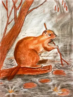 На картине изображён бобёр, который сидит на берегу маленького пруда. Он держит в лапках кусочек дерева и кажется, что он занимается строительством или просто отдыхает. Вокруг — зелёные деревья и трава, а в воде плавают камешки и водоросли. Настроение спокойное и уютное. Цвета — мягкие и природные: коричневый, зелёный, голубой и бежевый. Картина простая, тёплая и приятная для глаз.