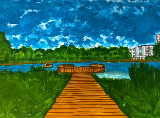 Мы с братом любим рыбачить на удочку. Далеко ходить нам никуда не надо - это рядом с домом, на озере в парке Дубрава. Я нарисовал озеро с домиком для уток и мостик, с которого мы рыбачим.