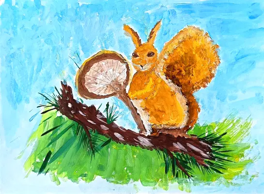 Рисунок «Лесная находка» отражает, как белочки активно готовятся к зиме, запасаясь пищей. Рисунок выполнен в технике работы гуашью.