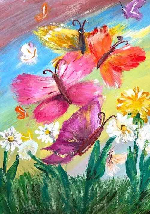 Рисунок «Бабочки» был создан, вдохновляясь природой посёлка Шишкин лес. Рисунок выполнен в технике работы гуашью, передавая ту неповторимую атмосферу летнего дня в Шишкином лесу, когда воздух наполнен ароматом цветов и порханием бабочек.