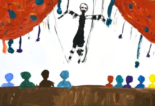На рисунке акробат изящно развивается в воздухе, вызывая у зрителей волну эмоций. Шары и воздушные змеи поднимаются под головами зрителей, приглашая всех оказаться в волшебной стране. Атмосфера наполнена трепетом и радостью, словно настроение цирка захватывает каждого, приглашая поверить в чудеса и забыть обо всех заботах!