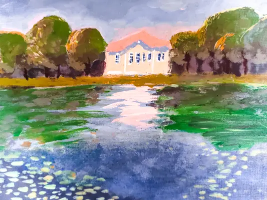 Тихое поэтическое место с заводью в усадьбе Голицыных «Влахернское-Кузьминки». Зелёная ряска на воде, тёплый летний вечер и отражение в воде особняка 19 века. Работа формат А3, холст, акрил.