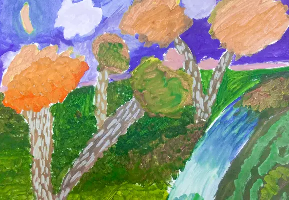 Осенние мотивы и приятные впечатления после прогулки в парке Кузьминки всей семьей. Золотая осень, голубое небо и небольшой обводной канал. Работа формата а2, тех.гуашь.