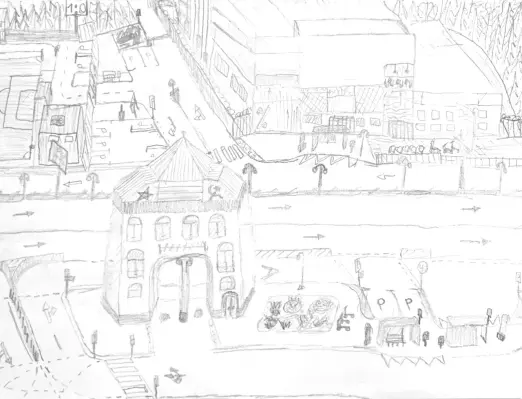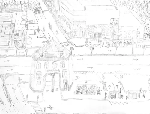 Я нарисовал простым карандашом то место, где я играю в футбол с моим братом, гуляю по лесу, хожу по магазинам и кафе, катаюсь на самокате и велосипеде.