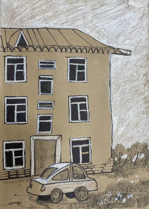 Для работы использованы маркер, мел и гелевая ручка. Здесь изображён дом постройки 1955 года. Во внутреннем дворике царит очень приятная атмосфера. Это спокойствие я постаралась изобразить в моей работе. Дом такой маленький и уютный, как будто он из какой-то доброй сказки. Рисовать я начала недавно, поэтому это одна из первых моих работ, но я её очень люблю! Эта постройка представляет собой архитектурную ценность и нуждается в реставрации. Своим рисунком я бы хотела обратить внимание на вопрос о сохранении культурного наследия для будущих поколений.