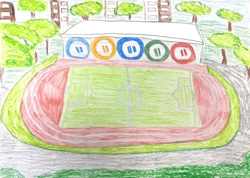 На рисунке изображен стадион «Москвич» в Текстильщиках. Раньше мы туда часто ходили смотреть разные матчи, поэтому это место является особенным для нашей семьи. У стадиона интересная история, он открылся в 1969 году и назывался «АЗЛК».