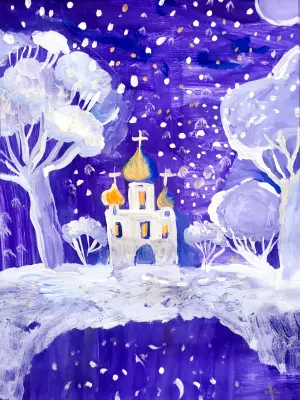 Художник изобразил известный храм Влахернской в зимний период перед большим христианским праздником Крещения. Работа выполнена в такой холодной, морозной гамме, чтобы подчеркнуть крещенские морозы, которые обычно наступают в этот праздничный день! Формат А3, техника «гуашь».