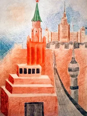 В своей работе Артём изобразил основные достопримечательности Москвы: мавзолей, башню Кремля с кремлевской стеной, Останкинскую телебашню, здание МГУ, монумент «Покорителям космоса».