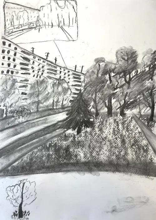 На рисунке изображена улица Дубнинская, я рисовала ее с натуры на плэнере. Рядом с этим местом находится моя художественная студия «Авангард», куда я хожу уже 7 лет. Мне очень нравится рисовать и нравится моя студия. Мы рисуем разными материалами: красками, карандашами, пастелью, углем. Этот рисунок сделан углем.На рисунке изображена улица Дубнинская, я рисовала ее с натуры на плэнере. Рядом с этим местом находится моя художественная студия «Авангард», куда я хожу уже 7 лет. Мне очень нравится рисовать и нравится моя студия. Мы рисуем разными материалами: красками, карандашами, пастелью, углем. Этот рисунок сделан углем.