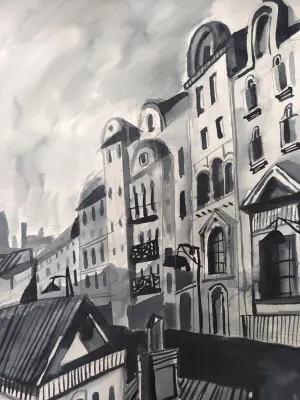 На работе изображён исторический район города Москвы - Чистые пруды. Ночное небо украшают красивые, резные линии крыш и фасадов старых домов. Работа формат А3, техника: тушь, бумага.