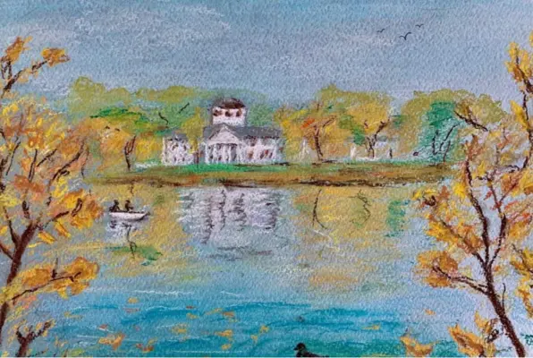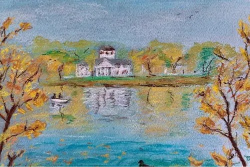 Свою работу я рисовала с натуры на пленэре. В этот день была очень хорошая солнечная погода, и небо и деревья отражались в воде пруда. Хотелось передать настроение осеннего дня, когда «усадьба» утопала в желтых красках. Очень здорово, что в нашем районе есть такое красивое место!