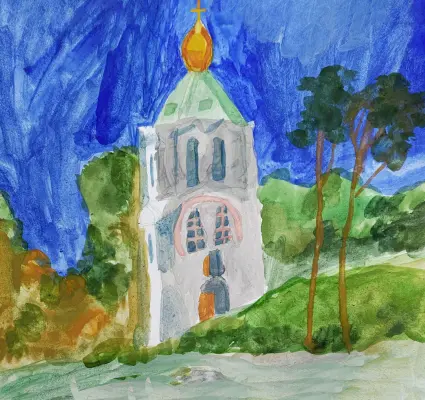Красивый живописный этюд, сделанный на летней практике-пленэре в городе Москве. Часовня на Боровицкой площади Николая Чудотворца на Знаменке. Формат работы А3, техника: акварель, бумага