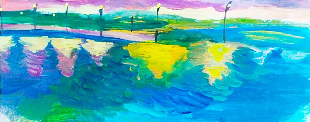 Тёплый летний вечер. Вдоль водоёма вереницей выстроились фонари. Яркий свет длинными, цветными бликами падает на гладь воды. Живописный этюд. Техника: гуашь, акварель.