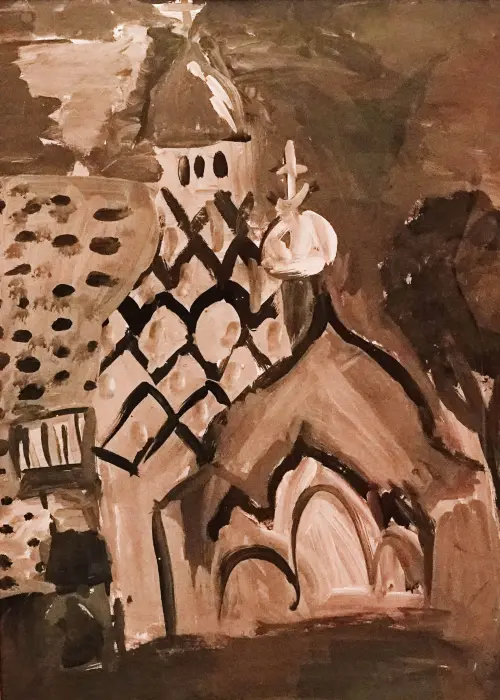 Вместе со студией мы рисовали на пленэре прекрасный храм Новомучеников. Он имеет такое название, потому что много людей пострадало, но не предало свою Веру. Когда я рисовала, я думала об этом и хотела передать своё настроение и восхищение этими людьми и храмом. Моя работа выполнена в технике «гризайль». Наш педагог поставил нам задачу показать церковь в городском пейзаже, я очень старалась это выполнить и передать свои чувства