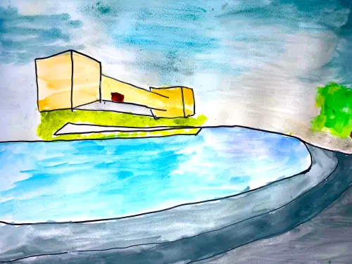 Мы часто гуляем в нашем районе, больше всего он мне нравится летом, когда все зёленое и солнечное. Это время года меня вдохновило на создание этой работы.