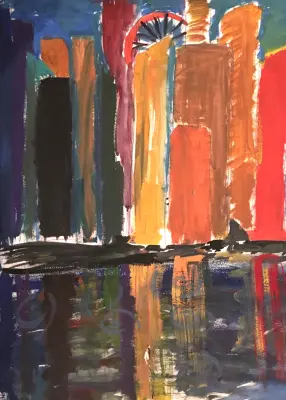Мне рассказывал папа, что раньше здесь был тушинский аэродром. И было видно, как в небе пилотируют с парашютами спортсмены, но тогда это было просто пустое поле. А теперь на этом месте выросли такие разные высотки! В своём пейзаже я хотел передать взгляд и фантазию художника на современную архитектуру за берегом Москва-реки. Меня вдохновил этот вечер, и я мечтал и думал о том, что, скорее всего, стану архитектором и придумаю город будущего.