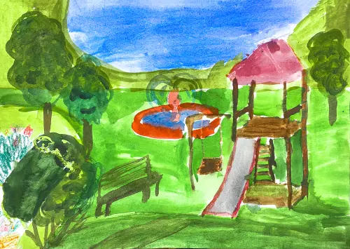 Я живу в Донском районе г. Москвы. Мой район очень красивый. Тут есть много площадок, спортивных объектов. Я нарисовала площадку и фонтан в своём любимом парке у пруда Бекет.