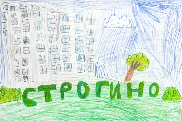 На рисунке ярком, словно сон, я изобразила свой район. Многоэтажный дом, зелёный сквер, и облака плывут на нём. Люблю тебя я - мой район! Строгино.