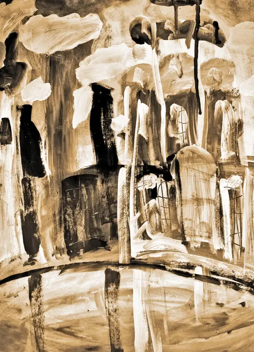 На пленэрных этюдах мы рисовали у реки, напротив храма в честь святого князя Владимира. Ольга Феодосьевна дала нам задание нарисовать не сам храм и пейзаж, а своё впечатление. Она разрешила рисовать одним только цветом. Она часто ставит нам такие сложные задачи, но мне это нравится, и у меня так получается даже лучше. Поэтому в своей работе я рисовала своё настроение! Сначала мне не очень нравилось, как получается. Но вдруг случилось чудо! Солнце продолжало светить, но пошёл дождь!! Всё стало таким ярким, и храм будто бы засветился и отражался в воде! Дождь быстро закончился. Этот день я никогда не забуду!