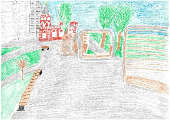 Эта картина об одном очень уютном и красивом сквере, расположенном в районе Марьина роща на Шереметьевской улице возле храма «Нечаянная Радость». Мы очень любим там проводить время.