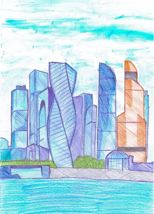 Гуляли с мамой по набережной, и я впервые увидел Москва-Сити так близко. Я решил изобразить это место на своём рисунке. Теперь моя мечта - побывать на самом высоком этаже башни.