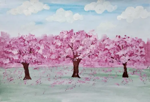 Ване очень нравится когда цветут яблони в саду. Рисунок выполнен гуашевыми красками с использованием различных цветов и методов.