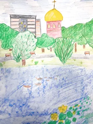 Это мой любимый пруд. Я люблю тут гулять с мамой и кормить уточек. А еще тут много качелей, есть детская площадка и церковь. Как хорошо , когда есть лето и каникулы!