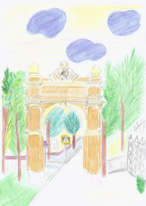 Одно из самых красивых мест для прогулок у нас в районе - это Липовый парк. Здесь, у входа, стоит большая-большая арка. Мама рассказала, что это историческая арка, которая является не только архитектурным памятником, но и важным символом истории и культуры нашего района. Она связывает целые поколения и вдохновляет своим величием.