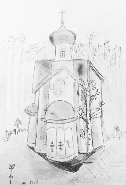 «Храм новомученников Подольских», бумага, карандш. Православный храм «Церковь собора Новомучеников Подольских» по адресу Москва, Троицкий административный округ, Краснопахорский район, посёлок Шишкин Лес, 42А, стр. 1