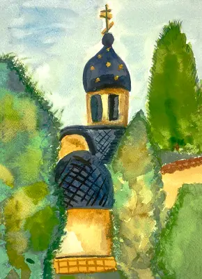 «Храм в Шишкином Лесу», бумага, акварель. Православный храм «Церковь собора Новомучеников Подольских» по адресу Москва, Троицкий административный округ, Краснопахорский район, посёлок Шишкин Лес, 42А, стр. 1. В 2000 г. по инициативе жителей поселка построен новый каменный храм в честь Собора новомучеников Подольских, замученных и расстрелянных. Одноглавый четверик храма завершен высоким барабаном и большой луковичною главою. В настоящее время в храмовый комплекс вошли: большой церковный дом с помещениями для церковноприходской школы, библиотеки, крестильни.