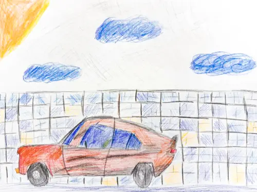 Я нарисовал такой рисунок, потому что мы с папой часто паркуем машину вместе. Обычно это долго. У всех наших соседей есть машины, и все ищут парковку. Мне очень нравится ездить на нашей машине. И я люблю, когда она «спит» под моим окном, чтобы вечером посмотреть на неё.