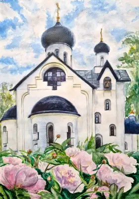 «Храм Подольских Новомученников в Шишкином Лесу», бумага, акварель. Православный храм «Церковь собора Новомучеников Подольских» по адресу Москва, Троицкий административный округ, Краснопахорский район, посёлок Шишкин Лес, 42А, стр. 1