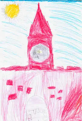 Мы несколько раз гуляли по Александровскому саду и Манежной площади, и Андрей запомнил, как выглядят башни Кремля. Он решил нарисовать Кремль, часы на Спасской башне, который в Новый год отбивают символические удары.