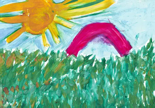 Меня зовут Бурчаков Артём, мне 4 года. Я увидел, что мои сестры рисуют для конкурса "Мой район" и тоже очень захотел принять участие. Я нарисовал вид, который открывается с Крылатских холмов на яркий красный мост. Он называется Живописным мостом. Рисунок выполнен акварельными красками.