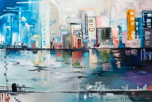 В этой работе представлен посёлок Шишкин Лес, как город будущего. Эта картина выполнена художественным маслом в технике абстракционизма. Полотно олицетворяет прогресс посёлка через столетия.