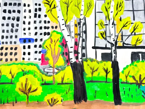 Во дворе моего дома растут красивые берёзы. Летом берёза дарит нам прохладную тень. Осенью листья берёзы становятся жёлтыми, красными, оранжевыми, и весь двор превращается в яркий ковёр. Зимой берёзы стоят в белых нарядах, словно принцессы в сверкающих платьях. Я люблю наш двор и наши берёзы.