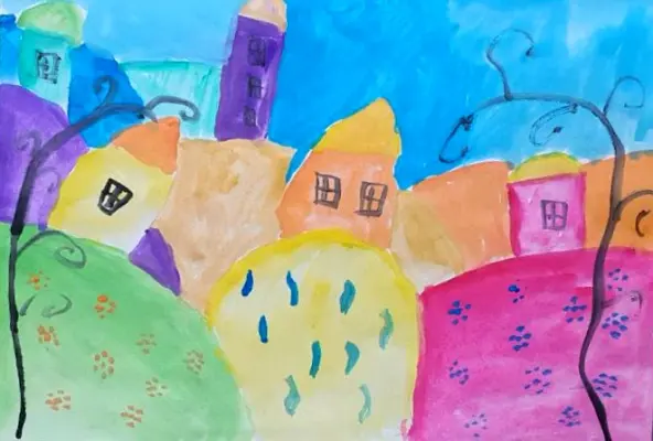 Когда я рисовал этот рисунок, я представлял, что наш район будет светиться разными огнями, как на Новый год. Он похож на сказочный. И яркие лампочки я очень люблю. Пусть их будет побольше у нас на улице.
