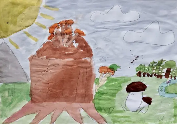 Я иду в лес за грибами. Там такие большие деревья, и листья шуршат под ногами. Я нашла много маленьких грибочков — беленькие и красненькие! Птички поют, и бабочки летают вокруг. Ветерок прохладный, а солнце светит сквозь ветки. Мне так интересно искать грибы, и я чувствую себя настоящим исследователем!