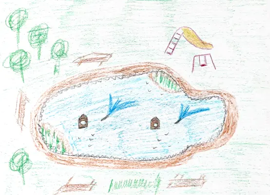 Я с мамой, папой и братом очень люблю гулять у Беловежского пруда. Мы там кормим уточек, наблюдаем за рыбками и фонтанами. Там есть замечательная детская площадка, где я люблю играть со своими подружками.