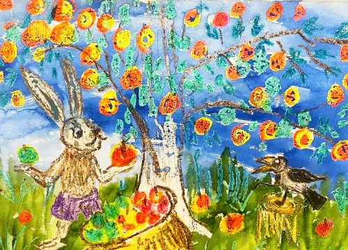 В своей картине я нарисовал зайца, который собирает яблоки. В моем представлении название сада появилось от яблок. Потому что когда цветут яблони, сад играет яркими красками