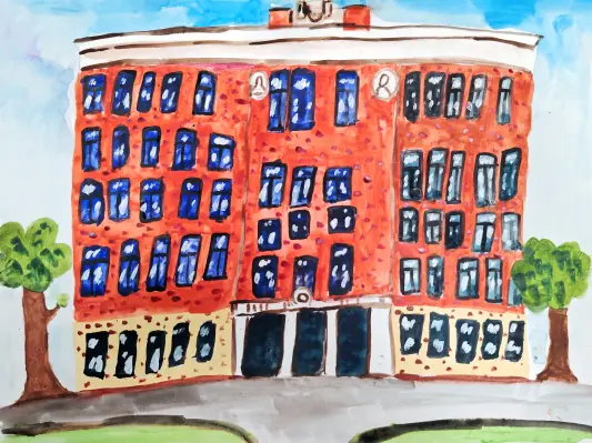 Эта школа № 664 находится в нашем районе. Она очень красивая! Построена из красного кирпича. На стенах барельефы знаменитых писателей. Она очень старинная. И под ней даже есть бомбоубежище.
