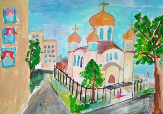 На рисунке изображён храм, который находится в районе Кунцево. При создании работы использовались акварельная краска, фломастеры, акварельная бумага, простой карандаш.