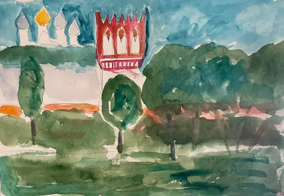Мы с семьёй часто гуляем около Новодевичьего монастыря. Ловим летом рыбу в пруду. С мамой и сестрой кормим уток. Один раз мы пошли гулять на пруд, взяли с собой краски, водичку, кисточки и дощечку для рисования. Я решил нарисовать башню Царицы Софьи, она очень красивая!