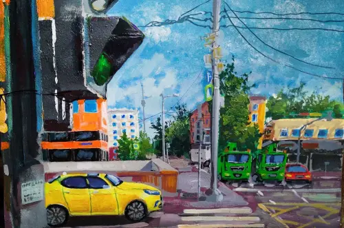 Возвращаясь с утренний пробежки мне понравился вид на мою улицу. Раннее утро. Солнце взошло. Солнце нужными лучами осветило дома и кроны деревьев, а от дорожных знаков и фанарных столбов пролегли длинные холодные тени. Работу выполнил на листе формата а3 акриловыми красками.