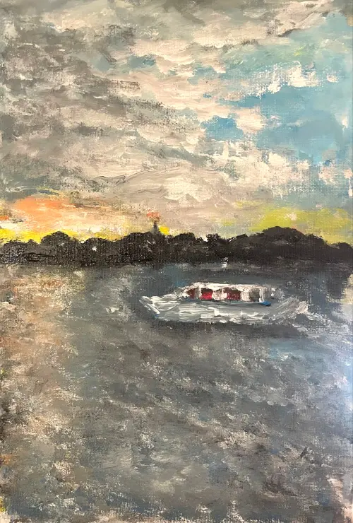 Я люблю заниматься спортом. В выходные я занимаюсь спортивной ходьбой и бегом. Мы всей семьёй ходим гулять в нашем районе вдоль набережных. Однажды тёплым летним вечером я гуляла по Фрунзенской набережной, и был красивый закат, который отражался в Москве реке. Я его сфотографировала и нарисовала потом дома.