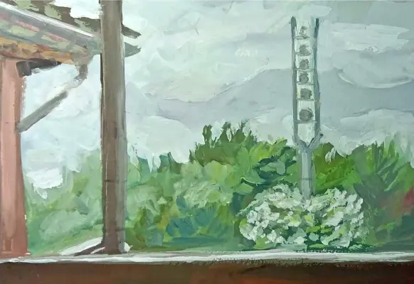 Я нарисовал вид из моего окна. На улице тёплая погода. На деревьях распустились листики. На небе плывут облака. Очень приятно смотреть за природой из окна.