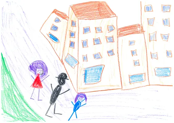 Мы с родителями гуляем во дворе дома и собираемся пойти в наш любимый сквер. На рисунке изображены мама, папа и я. Мы очень любим гулять в нашем районе